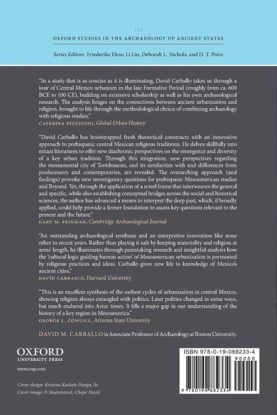 Urbanization and Religion in Ancient Central Mexico examines the ways in which urbanization and religion intersected in pre-Columbian central Mexico, with a primary focus on the later Formative period and the transition to the Classic period. The major societal transformations of this interval occurred approximately two-thousand years ago and over a millennium before Mexico's best known early civilization, the Aztecs. David M. Carballo presents a synthesis of data from regional archaeological projects and key sites such as Teotihuacan and Cuicuilco, while relying on his own excavations at the site of La Laguna as the central case study. A principal argument is that cities and states developed hand in hand with elements of a religious tradition of remarkable endurance and that these processes were fundamentally entangled. Prevalent religious beliefs and ritual practices created a cultural logic for urbanism, and as populations urbanized they became socially integrated and differentiated following this logic. Nevertheless, religion was used differently over time and by groups and individuals across the spectra of urbanity and social status. The book provides a materially informed history of religion, with the temporal depth that archaeology can provide, and an archaeology of cities that considers religion seriously as a generative force in societal change.