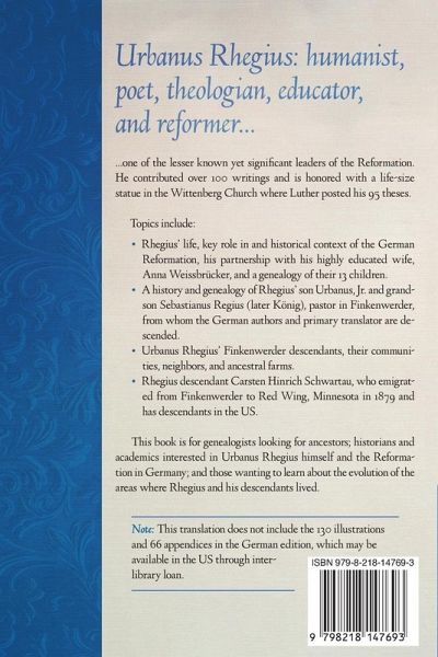Urbanus Rhegius: humanist, poet, theologian, educator, and reformer... ...one of the lesser known yet significant leaders of the Reformation. He contributed over 100 writings and is honored with a life-size statue in the Wittenberg Church where Luther posted his 95 theses. Topics include:Rhegius' life, key role in and historical context of the German Reformation, his partnership with his highly educated wife, Anna Weissbrücker, and a genealogy of their 13 children. A history and genealogy of Rhegius' son Urbanus, Jr. and grandson Sebastianus Regius (later König), pastor in Finkenwerder, from whom the German authors and primary translator are descended. Urbanus Rhegius' Finkenwerder descendants, their communities, neighbors, and ancestral farms. Rhegius Finkenwerder descendant Carsten Hinrich Schwartau, who emigrated to Red Wing, MN in 1867 and has descendants in the US. This book is for genealogists looking for ancestors; historians and academics interested in Urbanus Rhegius himself and the Reformation in Germany; and those wanting to learn about the evolution of the areas where Rhegius and his descendants lived. Note: This translation does not include the 129 illustrations and 65 appendices in the German edition, which may be available in the US through inter-library loan.