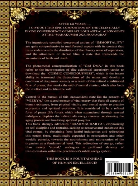 THIS BOOK IS A FOUNTAINHEAD OF HUMAN EXCELLENCE! The ingeniously compiled conceptual antlers of "IMMORTALITY" are quite comprehensive in multifaceted aspects with its context that transcends towards the dissolution of the illusory sense of separation and the attainment of eternal bliss, a state of being that transcends the vicissitudes of birth and death. The phenomenal conceptualization of "God DNA," which refers to the incorporation of elite existential superiority tactics to download the cosmic consciousness, which is the innate ability to transcend the distractions of the senses and develop a condition of deep inner serenity as a result of this refined conditioned flow of prana, that marks the end of mental chatter, which also feeds the intellect and fortifies the will! Central to the pursuit of this transcendent state lies the concept of "VEERYA," the essence of vital energy-a potent force that fuels all aspects of human existence, from physical vitality and mental acuity to creative expression and spiritual evolution. This vital energy, considered to be a refined form of prana (life force), is believed to be finite, a precious resource that, when squandered through sensual indulgence, depletes the individual's energy reserves, accelerating the aging process and hindering spiritual progress. AFTER 144 YEARS... I GIVE OUT THIS EPIC COMPOSITION ON THE CELESTIALLY DIVINE CONVERGENCE OF MIRACULOUS ASTRAL ALIGNMENTS AT THE "MAHAKUMBH 2025. PRAYAGRAJ"..!!