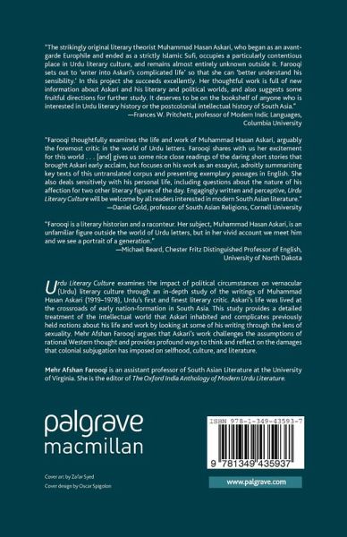 'Farooqi thoughtfully examines the life and work of Muhammad Hasan Askari, arguably the foremost critic in the world of mid-twentieth century Urdu letters. Farooqi shares with us herexcitement for this world, which included movements of aesthetic innovation, leftist literary progressivism, and renewed Islamic identity. She shows us how Askari achieved insights into all these movements, but from his own perspective one grounded in the classical Urdu literary heritage but informed both by Western literary critical thought. Farooqi gives us some nice close readings of the daring short stories that brought Askari early acclaim but focuses on his later, much more voluminous, work asan essayist, adroitly summarizing key texts of this untranslated corpus and presenting exemplary passages in English. She also deals sensitively with his personal life, including questions about the nature of his affection for two other literary figures of the day. Engagingly written and perceptive, Urdu Literary Culture will be welcome by all readers interested in modern South Asian literature.' - Daniel Gold, Professor, South Asian Religions, Department of Asian Studies, Cornell University