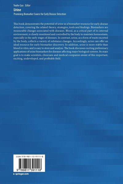 This book demonstrates the potential of urine as a biomarker resource for early disease detection, covering the related theory, strategies, tools and findings. Biomarkers are measurable changes associated with diseases. Blood, as a critical part of its internal environment, is closely monitored and controlled by the body to maintain homeostasis, especially in the early stages of diseases. In contrast, urine, as a form of waste excreted by the body, collects a variety of substance changes. Accordingly, urine can offer an ideal resource for early biomarker discovery. In addition, urine is more stable than blood in vitro, and is easy to store and analyze. The book discusses exciting preliminary applications of urine biomarkers for diseases affecting major biological systems. Its main goal is to make scientists, clinicians and medical companies aware of this important, exciting, undeveloped, and profitable field.