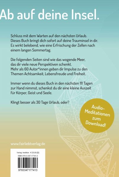 Schluss mit dem Warten auf den nächsten Urlaub.Dieses Buch bringt dich sofort auf deine Trauminsel in dir. Es wirkt belebend, wie eine Erfrischung der Zellen nach einem langen Sommertag. Die folgenden Seiten sind wie das wogende Meer, das dir viele neue Perspektiven schenkt. Mehr als 60 Autor_innen geben dir täglich Impulse, erzählen Geschichten oder teilen Übungen zu den Themen Achtsamkeit, Lebensfreude und Freiheit. Immer, wenn du dieses Buch in den nächsten 111 Tagen zur Hand nimmst, schenkst du dir eine kleine Auszeit für Körper, Geist und Seele. Klingt besser als 30 Tage Urlaub, oder?
