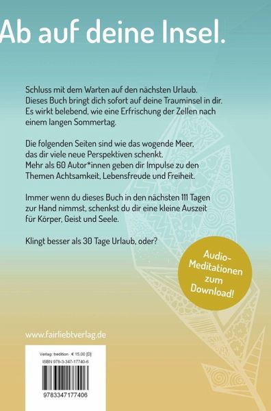 Schluss mit dem Warten auf den nächsten Urlaub.Dieses Buch bringt dich sofort auf deine Trauminsel in dir. Es wirkt belebend, wie eine Erfrischung der Zellen nach einem langen Sommertag. Die folgenden Seiten sind wie das wogende Meer, das dir viele neue Perspektiven schenkt. Mehr als 60 Autor_innen geben dir täglich Impulse, erzählen Geschichten oder teilen Übungen zu den Themen Achtsamkeit, Lebensfreude und Freiheit. Immer, wenn du dieses Buch in den nächsten 111 Tagen zur Hand nimmst, schenkst du dir eine kleine Auszeit für Körper, Geist und Seele. Klingt besser als 30 Tage Urlaub, oder?