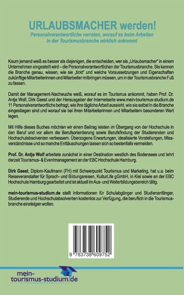 Kaum jemand weiß es besser als diejenigen, die entscheiden, wer als "Urlaubsmacher" in einem Unternehmen eingestellt wird - die Personalverantwortlichen der Tourismusbranche. Sie kennen die Branche genau, wissen, wie sie "tickt" und welche Voraussetzungen und Eigenschaften zukünftige Mitarbeiterinnen und Mitarbeiter mitbringen müssen, um in der Tourismusbranche Fuß zu fassen.Damit der Management-Nachwuchs weiß, worauf es im Tourismus ankommt, haben Prof. Dr. Antje Wolf, Dirk Geest und der Herausgeber der Internetseite www.mein-tourismus-studium.de 11 Personalverantwortliche befragt, wie ihre tägliche Arbeit aussieht, wie sie selbst in die Branche eingestiegen sind und worauf sie bei ihren Mitarbeiterinnen und Mitarbeitern besonderen Wert legen.Mit Hilfe dieses Buches möchten wir einen Beitrag leisten im Übergang von der Hochschule in den Beruf und vor allem die Berufsorientierung sowie Berufsfindung der Studierenden und Hochschulabsolventen verbessern. Überzogene Erwartungen, idealisierte Vorstellungen, Missverständnisse und so manche Enttäuschungen lassen sich so bestenfalls vermeiden.