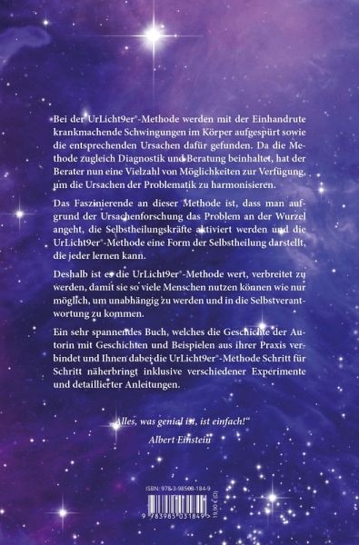 Bei der UrLicht9er®-Methode werden mit der Einhandrute krankmachende Schwingungen im Körper aufgespürt sowie die entsprechenden Ursachen dafür gefunden. Da die Methode zugleich Diagnostik und Beratung beinhaltet, hat der Berater nun eine Vielzahl von Möglichkeiten zur Verfügung, um die Ursachen der Problematik zu harmonisieren.Das Faszinierende an dieser Methode ist, dass man aufgrund der Ursachenforschung das Problem an der Wurzel angeht, die Selbstheilungskräfte aktiviert werden und die UrLicht9er®-Methode eine Form der Selbstheilung darstellt, die jeder lernen kann.Deshalb ist es die UrLicht9er®-Methode wert, verbreitet zu werden, damit sie so viele Menschen nutzen können wie nur möglich, um unabhängig zu werden und in die Selbstverantwortung zu kommen. Ein sehr spannendes Buch, welches die Geschichte der Autorin mit Geschichten und Beispielen aus ihrer Praxis verbindet und Ihnen dabei die UrLicht9er®-Methode Schritt für Schritt näherbringt inklusive verschiedener Experimente und detaillierter Anleitungen.