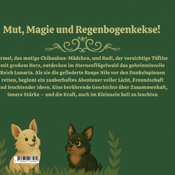 Urmel und Rudi Magische Pfötchenreisen: Der Sternenflügelwald Ein Kinderbuch ab 5 Jahren über Mut, Freundschaft und ein kleines Leuchten, das Großes bewirkt Urmel Kekspfote ist quirlig, mutig und liebt Regenbogenkekse. Ihr bester Freund Rudi Kuchenpfote ist vorsichtig, aber ein brillanter Tüftler mit großem Herzen. Gemeinsam entdecken sie den geheimnisvollen Sternenflügelwald und treffen dort auf Nilo eine kleine Raupe mit leuchtenden Regenbogenflügeln. Doch dunkle Spinnenwesen bedrohen den Wald! Urmel und Rudi müssen all ihren Mut zusammennehmen, um Nilo zu helfen und entdecken dabei, dass auch kleine Pfoten große Wunder vollbringen können. Ein zauberhaftes Vorlesebuch mit liebevollen Illustrationen, Mitmachseiten, Bastelideen und Regenbogenrezepten. Für Kinder ab 5 Jahren, zum Vorlesen, Staunen und Selberentdecken. Mit dabei: Bastelanleitungen Ausmalbild & Rätselseite Regenbogenkeks- und Kuchenrezept