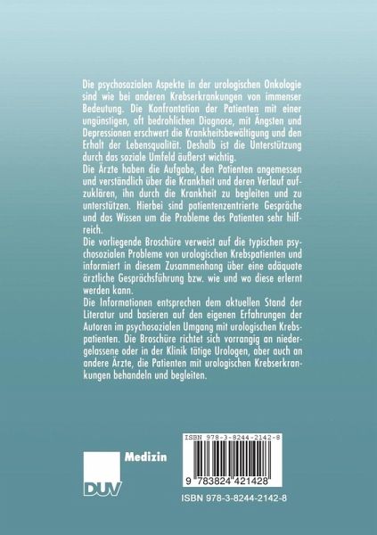 Die Informationen entsprechen dem aktuellen Stand der Literatur und basieren auf den eigenen Erfahrungen der Autoren im psychosozialen Umgang mit urologischen Krebspatienten. Die Broschüre richtet sich vorrangig an niedergelassene oder in der Klink tätige Urologen, aber auch an andere Ärzte, die Patienten mit urologischen Krebserkrankungen behandeln und begleiten.