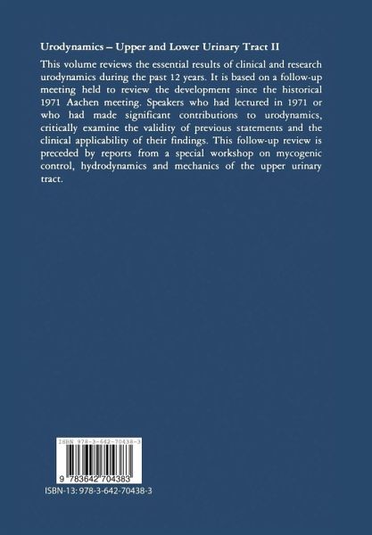Workshop on Upper Urinary Tract Urodynamics.- I. Myogenic Control for the Upper Tract.- Passive Properties of the Smooth Muscle of the Pig Ureter.- Myogenic Function of Normal and Chronically Dilated Pyeloureters.- Modelling of the Propagation of an Action Potential Along the Ureter.- Voltage- and Agonist-Induced Activation of Smooth Muscle of the Human Upper Urinary Tract: Different Mechanisms.- Effects of ?-Adrenergic Agonists on the Action Potentials of Canine Pyeloureter.- Effects of Some Directly-Acting Smooth Muscle Relaxant Drugs on Isolated Human Preparations of the Upper Urinary Tract.- Search for Anisotropy in Specific Electrical Conductance of Ureteral Tissue as a Measure of Muscle-Fiber Structure.- II. Hydrodynamics and Mechanics of the Upper Tract.- Kinetic Urography.- The Reproducibility of the Pressure-Flow Relationship in the Normal Upper Urinary Tract of the Pig.- The Time-Distance Diagram of the Ureteral Transport.- Mechanics of the Upper Tract.- The Propagation Velocity of Contractions of the Pig Ureter in Vitro.- Assessment of Ureteric Dynamics by Simultaneous Electric Conductance Measurements at Two Sites.- Imaging of Peristaltic Urine Transport in the Ureter Using 123Jodine Hippurate.- The Nuclear Medical Space Time Matrix Approach to Ureteral Motility.- Dynamics of the Ureterovesical Junction.- Upper and Lower Urinary Tract Urodynamics - Reviewing the Aachen 1971 Meeting.- I. Lower Tract Urodynamics.- Innervation and Histologic Characteristics of the Urinary External Sphincter.- The Scrotal Flap Technique as an Operative Method for the Treatment of Iatrogenic and Posttraumatic Male Incontinence.- A Urodynamic Review of Bladder Outlet "Obstruction" in the Male and Its Treatment.- Surface Factors in Recurrent Infection.- Causes andConsequences of Bladder Neck Obstruction.- Urinary Velocity: Twelve Years Later.- Review of Techniques to Evaluate Micturitional Performance. Promises of 1971 Revisited.- II. Upper Tract Urodynamics.- Ureteric Ultrastructure - 12 Years on.- Innervation of the Ureter: A Histochemical and Ultrastructural Study.- Progress in Diagnosis of Ureteral Urodynamics.- Ureteral Urodynamics: Past and Future.