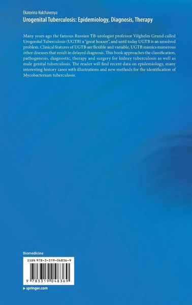 Introduction.- Epidemiology of Urogenital Tuberculosis as a part of Extrapulmonary Tuberculosis.- Classification of Urogenital Tuberculosis.- Clinical features of Urogenital Tuberculosis.- Diagnostic of Urogenital Tuberculosis.- Predisposition, Pathogenesis and Prophylaxis.- Bladder tuberculosis.- Male genital tuberculosis.- Therapy of Urogenital Tuberculosis.- Surgery of Urogenital Tuberculosis.- Acknowledgments.- References.