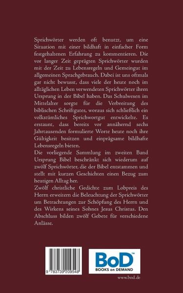 Ursprung Bibel - Band 2 ist das zweite Sachbuch mit Lyrik des Autorenteams Mike Almara im christlichen Bereich.Bereits vor langer Zeit geprägte Sprichwörter wurden mit der Zeit zu Lebensregeln und Gemeingut im allgemeinen Sprachgebrauch. Dabei ist uns oftmals gar nicht bewusst, dass viele der heute noch im alltäglichen Leben verwendeten Sprichwörter ihren Ursprung in der Bibel haben.Es erstaunt, dass bereits vor annähernd sechs Jahrtausenden formulierte Worte heute noch ihre Gültigkeit besitzen und einprägsame bildhafte Lebensregeln bieten. Die vorliegende Sammlung greift zwölf Sprichwörter, die der Bibel entstammen, auf und stellt mit kurzen Geschichten einen Bezug zum heutigen Alltag her.Zwölf christliche Gedichte zum Lobpreis des Herrn erweitern die Beleuchtung der Sprichwörter um Betrachtungen zur Schöpfung des Herrn und des Wirkens seines Sohnes Jesus Christus. Den Abschluss des Buches bilden zwölf Gebete für verschiedene Anlässe.