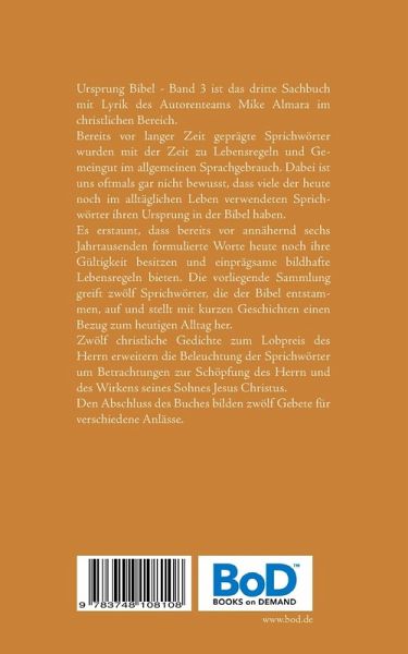 Ursprung Bibel - Band 3 ist das dritte Sachbuch mit Lyrik des Autorenteams Mike Almara im christlichen Bereich.Bereits vor langer Zeit geprägte Sprichwörter wurden mit der Zeit zu Lebensregeln und Gemeingut im allgemeinen Sprachgebrauch. Dabei ist uns oftmals gar nicht bewusst, dass viele der heute noch im alltäglichen Leben verwendeten Sprichwörter ihren Ursprung in der Bibel haben.Es erstaunt, dass bereits vor annähernd sechs Jahrtausenden formulierte Worte heute noch ihre Gültigkeit besitzen und einprägsame bildhafte Lebensregeln bieten. Die vorliegende Sammlung greift zwölf Sprichwörter, die der Bibel entstammen, auf und stellt mit kurzen Geschichten einen Bezug zum heutigen Alltag her.Zwölf christliche Gedichte zum Lobpreis des Herrn erweitern die Beleuchtung der Sprichwörter um Betrachtungen zur Schöpfung des Herrn und des Wirkens seines Sohnes Jesus Christus. Den Abschluss des Buches bilden zwölf Gebete für verschiedene Anlässe.