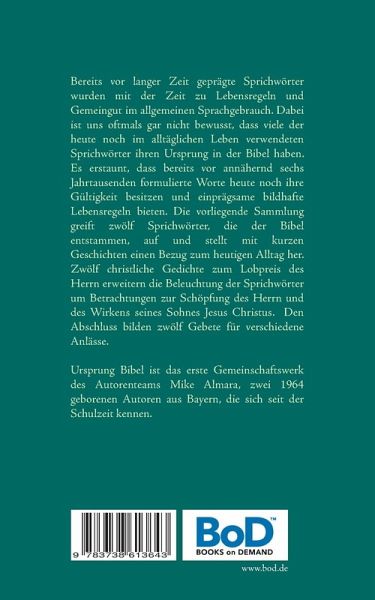 Ursprung Bibel ist das erste Gemeinschaftswerk des Autorenteams Mike Almara im christlichen Bereich.Bereits vor langer Zeit geprägte Sprichwörter wurden mit der Zeit zu Lebensregeln und Gemeingut im allgemeinen Sprachgebrauch. Dabei ist uns oftmals gar nicht bewusst, dass viele der heute noch im alltäglichen Leben verwendeten Sprichwörter ihren Ursprung in der Bibel haben.Es erstaunt, dass bereits vor annähernd sechs Jahrtausenden formulierte Worte heute noch ihre Gültigkeit besitzen und einprägsame bildhafte Lebensregeln bieten. Die vorliegende Sammlung greift zwölf Sprichwörter, die der Bibel entstammen, auf und stellt mit kurzen Geschichten einen Bezug zum heutigen Alltag her.Zwölf christliche Gedichte zum Lobpreis des Herrn erweitern die Beleuchtung der Sprichwörter um Betrachtungen zur Schöpfung des Herrn und des Wirkens seines Sohnes Jesus Christus. Den Abschluss des Buches bilden zwölf Gebete für verschiedene Anlässe.