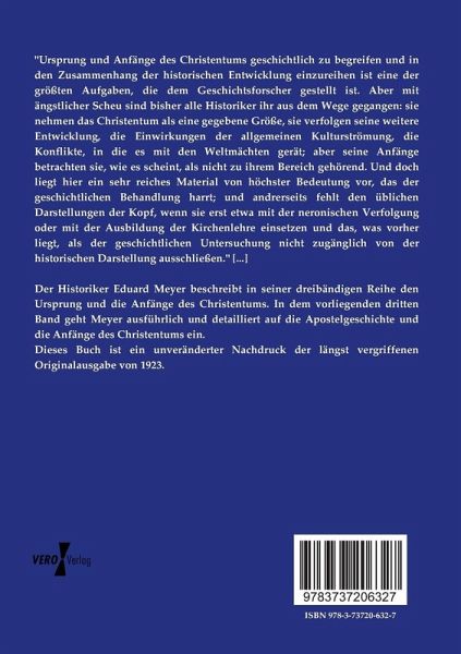 Der Historiker Eduard Meyer beschreibt in seiner dreibändigen Reihe den Ursprung und die Anfänge des Christentums. In dem vorliegenden dritten Band geht Meyer ausführlich und detailliert auf die Apostelgeschichte und die Anfänge des Christentums ein.