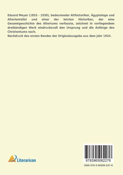 Eduard Meyer (1855 - 1930), bedeutender Althistoriker, Ägyptologe und Altorientalist und einer der letzten Historiker, der eine Gesamtgeschichte des Altertums verfasste, zeichnet in vorliegendem dreibändigen Werk eindrucksvoll den Ursprung und die Anfänge des Christentums nach.