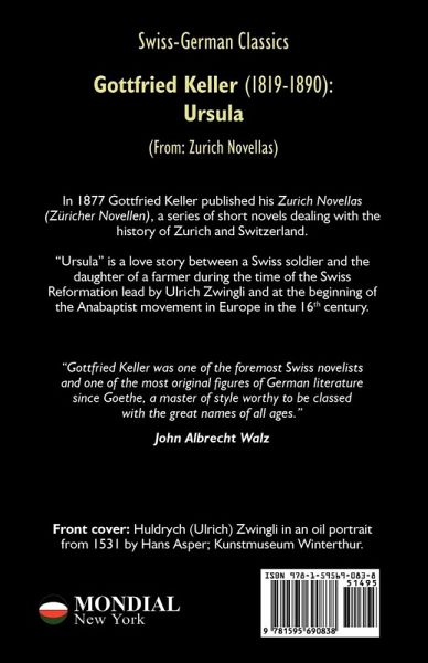 From the cycle "Zurich Novellas" by Gottfried Keller: In 1877 Gottfried Keller published his "Zurich Novellas" (Züricher Novellen), a series of short novels dealing with the history of Zurich and Switzerland. "Ursula" is a love story between a Swiss soldier and the daughter of a farmer during the time of the Swiss Reformation lead by Ulrich Zwingli and at the beginning of the Anabaptist movement in Europe in the 16th century. --- "Gottfried Keller was one of the foremost Swiss novelists and one of the most original figures of German literature since Goethe, a master of style worthy to be classed with the great names of all ages." (John Albrecht Walz)