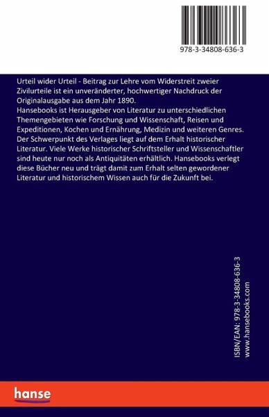 Urteil wider Urteil - Beitrag zur Lehre vom Widerstreit zweier Zivilurteile ist ein unveränderter, hochwertiger Nachdruck der Originalausgabe aus dem Jahr 1890.Hansebooks ist Herausgeber von Literatur zu unterschiedlichen Themengebieten wie Forschung und Wissenschaft, Reisen und Expeditionen, Kochen und Ernährung, Medizin und weiteren Genres. Der Schwerpunkt des Verlages liegt auf dem Erhalt historischer Literatur. Viele Werke historischer Schriftsteller und Wissenschaftler sind heute nur noch als Antiquitäten erhältlich. Hansebooks verlegt diese Bücher neu und trägt damit zum Erhalt selten gewordener Literatur und historischem Wissen auch für die Zukunft bei.