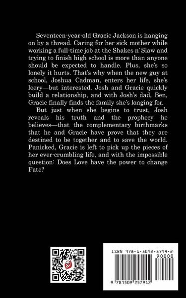Seventeen-year-old Gracie Jackson is hanging on by a thread. Caring for her sick mother while working a full-time job at the Shakes n' Slaw and trying to finish high school is more than anyone should be expected to handle. Plus, she's so lonely it hurts. That's why when the new guy at school, Joshua Cadman, enters her life, she's leery-but interested. Josh and Gracie quickly build a relationship, and with Josh's dad, Ben, Gracie finally finds the family she's longing for. But just when she begins to trust, Josh reveals his truth and the prophecy he believes-that the complementary birthmarks that he and Gracie have prove that they are destined to be together and to save the world. Panicked, Gracie is left to pick up the pieces of her ever-crumbling life, and with the impossible question: Does Love have the power to change Fate?