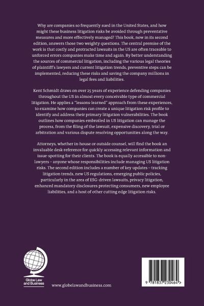 Why are companies so frequently sued in the United States, and how might these business litigation risks be avoided through preventative measures and more effectively managed? This book, now in its second edition, answers those two weighty questions. The central premise of the work is that costly and protracted lawsuits in the US are often traceable to unforced errors companies make time and again. By better understanding the sources of commercial litigation, including the various legal theories of plaintiff’s lawyers and current litigation trends, preventive steps can be implemented, reducing these risks and saving the company millions in legal fees and liabilities. Kent Schmidt draws on over twenty-five years of experience defending companies throughout the US in almost every conceivable type of commercial litigation. He applies a “lessons-learned” approach from these experiences, to examine how companies can create a unique litigation risk profile to identify and address their primary litigation vulnerabilities. The second part of the book outlines how companies embroiled in US litigation can manage the process, from the filing of the lawsuit, expensive discovery, trial or arbitration and various dispute resolving opportunities along the way. The book is written for a diverse audience. Attorneys, whether in-house or outside counsel, will find it a useful desk-reference for quickly accessing relevant information and issue-spotting for their clients. The book is equally accessible to non-lawyers – anyone whose responsibilities include managing US litigation risks. These persons include those in venture capital, CFOs and other members of management, risk management and compliance professionals, and entrepreneurs seeking to implement best practices as they launch a start-up or expand to US markets. The second edition includes a number of key updates: tracking litigation trends, new US regulations emerging public policies, particularly in the area of ESG-driven lawsuits, privacy litigation, enhanced mandatory disclosures protecting consumers, new employee liabilities, and a host of other cutting edge litigation risks.