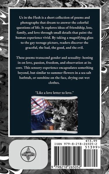 Us in the Flesh is a short collection of poems and photographs that dream to answer the colorful questions of life. It explores ideas of friendship, loss, family, and love through small details that paint the human experience vivid. By taking a magnifying glass to the gay teenage picture, readers discover the graceful, the bad, the good, and the evil. These poems transcend gender and sexuality- honing in on love, passion, freedom, and observation at its core. This sensory experience encapsulates something beyond, but similar to summer flowers in a sea salt bathtub, or sunshine on the face, drying out wet clothes. "Like a love letter to love."…mehr