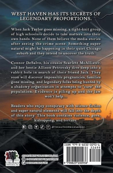West Haven has its secrets of legendary proportions. When Jack Taylor goes missing, a tight-knit group of high schoolers decide to take matters into their own hands. None of them believe the media stories after seeing the crime scene. Something super natural might be happening in their quiet Chicago suburb and they intend to uncover the truth. Connor DeSalvo, his cousin Scarlett McAllister, and her bestie Allison Petrovsky dive deep into a rabbit hole in search of their friend Jack. They soon will discover impossible pregnancies, families gone missing, and legendary folks being hunted by a shadowy organization in attempts to "cure" the population. Evidence is piling up and the law won't help... Readers who enjoy conspiracy with science fiction and super natural elements will fall into the depth of this story. This book contains violence, gore, kidnapping, and torture.