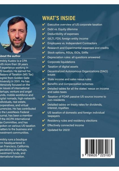 From the dashboard of a practicing CPA, a big-picture view presentation takes a meaningful look at taxation from the perspective of international startups and individuals who travel to the US to live here and work on their dreams. Navigating tax rules can be tricky, and it is easy to be blindsided. This book is designed to uncover many of those pitfalls and provide solutions. There are also opportunities to be explored, and we have detailed many of them here. Every startup CEO or financial executive involved in the compliance process should seek guidance from their tax advisers. Without a resource like this guide, they may not be well-prepared to know what questions to pose. Over time, many clients wished for reading materials that encapsulated the information we provided. As requested, we have crafted a book that's easy to go through and too valuable to overlook. It demystifies the US tax system, making it easy to deal with many of its confusing twists effectively. Please take a deep dive and let us know what you think! The information is provided for the 2023 rules. We will expand and update it every year in the new editions.