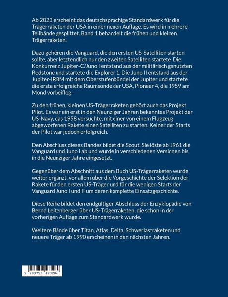Ab 2023 erscheint das deutschsprachige Standardwerk für die Trägerraketen der USA in einer neuen Auflage. Es wird in mehrere Teilbände gesplittet. Band 1 behandelt die frühen und kleinen Trägerraketen. Dazu gehören die Vanguard, die den ersten US-Satelliten starten sollte, aber letztendlich nur den zweiten Satelliten startete. Die Konkurrenz Jupiter-C/Juno I entstand aus der militärisch genutzten Redstone und startete die Explorer 1. Die Juno II entstand aus der Jupiter-IRBM mit dem Oberstufenbündel der Jupiter und startete die erste erfolgreiche Raumsonde der USA, Pioneer 4, die 1959 am Mond vorbeiflog.Zu den frühen, kleinen US-Trägerraketen gehört auch das Projekt Pilot. Es war ein erst in den Neunziger Jahren bekanntes Projekt der US-Navy, das 1958 versuchte, mit einer von einem Flugzeug abgeworfenen Rakete einen Satelliten zu starten. Keiner der Starts der Pilot war jedoch erfolgreich.Den Abschluss dieses Bandes bildet die Scout. Sie löste ab 1961 die Vanguard und Juno I ab und wurde in verschiedenen Versionen bis in die Neunziger Jahre eingesetzt.Gegenüber dem Abschnitt aus dem Buch US-Trägerraketen wurde weiter ergänzt, vor allem über die Vorgeschichte der Selektion der Rakete für den ersten US-Träger und für die wenigen Starts der Vanguard Juno I und II um deren komplette Einsatzgeschichte.Diese Reihe bildet den endgültigen Abschluss der Enzyklopädie von Bernd Leitenberger über US-Trägerraketen, die schon in der vorherigen Auflage zum Standardwerk wurde.Weitere Bände über Titan, Atlas, Delta, Schwerlastraketen und neuere Träger ab 1990 erscheinen in den nächsten Jahren.