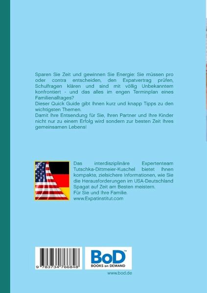 Sparen Sie Zeit und gewinnen Sie Energie für eine glückliche und erfolgreiche Entsendung in die USA. Expatentsendung mit der Familie in die USA für ein paar Jahre? Ja oder Nein? Sie müssen pro oder contra entscheiden, den Expatvertrag prüfen, Schulfragen klären und sind mit völlig Unbekanntem konfrontiert - und das alles im engen Terminplan eines Familienalltags? Was Sie brauchen ist ein schneller, exzellenter und umfassender Überblick von erfahrenen Expat-Insidern! Dieser Quick Guide gibt Ihnen kurz und knapp Tipps zu den wichtigsten Themen wie z.B.:Expatvertragsinhalte, Expat- und Partnerkarriere, Familie, TCK - Erziehung, Schulbildung USA, Anerkennung der Schulabschlüsse in Deutschland, Alltag und Kultur - Unterschiede in den USA, Erfolg im USA Geschäft, Rückkehrplanung...USA Expat Quick Guide - Vertrag, Familie, Karriere des interdisziplinären Expertenteams Tutschka-Dittmeier-Kuschel bietet Ihnen kompakte, zielsichere Hinweise und Informationen, wie Sie die Herausforderungen im USA-Deutschland Spagat auf Zeit am Besten meistern...Damit Ihre Entsendung für Sie, Ihren Partner und Ihre Kinder nicht nur zu einem Erfolg wird, sondern zur besten Zeit Ihres gemeinsamen Lebens!Experteninformationen sind einfach Gold wert! Für Sie und Ihre Familie.Weitere Informationen auf www.Expatinstitut.com.