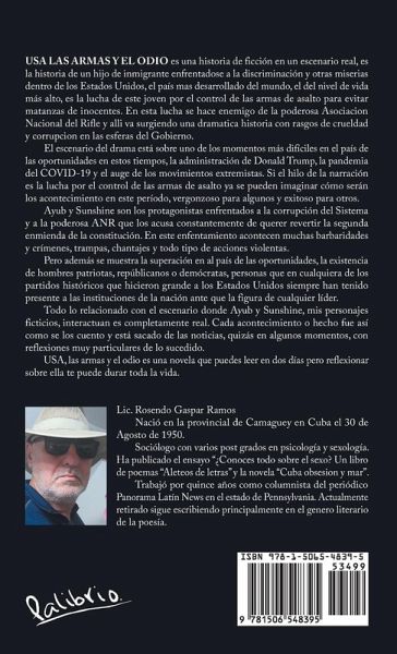 USA las armas y el odio es una historia de ficción en un scenario real, es la historia de un hijo de inmigrante enfrentadose a la discriminación y otras miserias dentro de los Estados Unidos, el país mas desarrollado del mundo, el del nivel de vida más alto, es la lucha de este joven por el control de las armas de asalto para evitar matanzas de inocentes. En esta lucha se hace enemigo de la poderosa Asociación Nacional del Rifle y alli va surgiendo una dramatica historia con rasgos de crueldad y corrupcion en las esferas del Gobierno. El escenario del drama está sobre uno de los momentos más difíciles en el país de las oportunidades en estos tiempos, la administración de Donald Trump, la pandemia del COVID-19 y el auge de los movimientos extremistas. Si el hilo de la narración es la lucha por el control de las armas de asalto ya se pueden imaginar cómo serán los acontecimiento en este período, vergonzoso para algunos y exitoso para otros. Ayub y Sunshine son los protagonistas enfrentados a la corrupción del Sistema y a la poderosa ANR que los acusa constantemente de querer revertir la segunda enmienda de la constitución. En este enfentamiento acontecen muchas barbaridades y crímenes, trampas, chantajes y todo tipo de acciones violentas. Pero además se muestra la superación en al país de las oportunidades, la existencia de hombres patriotas, repúblicanos o demócratas, personas que en cualquiera de los partidos históricos que hicieron grande a los Estados Unidos siempre han tenido presente a las instituciones de la nacióon ante que la figura de cualquier líder. Todo lo relacionado con el escenario donde Ayub y Sunshine, mis personajes ficticios, interactuan es completamente real. Cada acontecimiento o hecho fue así como se los cuento y está sacado de las noticias, quizás en algunos momentos, con reflexiones muy particulares de los sucedido. USA las armas y el Odio es una novela que puedes leer en dos días pero reflexionar sobre ella te puede durar toda la vida.