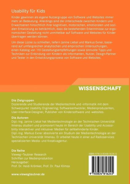 Um diese Lücke zu schließen, liefern Janine Liebal und Markus Exner, basierend auf umfangreichen analytischen und empirischen Untersuchungen, einen Katalog von 110 Gestaltungsempfehlungen sowie sinnvolle Tipps und Techniken zur Einbindung von Kindern als Informanten, Nutzer, Design-Partner und Tester in den Entwicklungsprozess von Software und Websites.