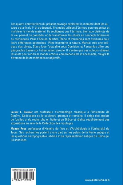 Les contributions de cet ouvrage examinent comment les auteurs antiques utilisent l'écriture pour maîtriser le monde matériel. Pline inventorie la nature, Martial poétise les objets, Stace loue Domitien, et Pausanias décrit la Grèce sur la base de ses propres observations. Le monde antique devient compréhensible par les mots.