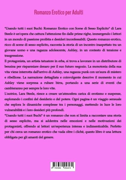 "Usando tutti i suoi Buchi: Romanzo Erotico con Scene di Sesso Esplicito" di Lara Steele è un'opera che cattura l'attenzione fin dalle prime righe, immergendo i lettori in un mondo di passione proibita e desideri inconfessabili. Questo romanzo erotico, ricco di scene di sesso esplicito, racconta la storia di un incontro inaspettato tra un giovane uomo e una ragazza adolescente, Ashley, in un contesto di tensione e trasgressione.Il protagonista, un artista tatuatore in erba, si trova a lavorare in un distributore di benzina per risparmiare denaro per il suo futuro negozio. La monotonia della sua vita viene interrotta dall'arrivo di Ashley, una ragazza punk con un'aura di mistero e ribellione. La narrazione dettagliata e coinvolgente descrive il momento in cui Ashley viene sorpresa a rubare birra, portando a una serie di eventi che cambieranno per sempre le loro vite.L'autrice, Lara Steele, riesce a creare un'atmosfera carica di erotismo e suspense, esplorando i confini del desiderio e del potere. Ogni pagina è un viaggio sensuale che esplora le dinamiche complesse tra i personaggi, mettendo in luce le loro vulnerabilità e i loro desideri più profondi."Usando tutti i suoi Buchi" è un romanzo che non si limita a raccontare una storia di sesso esplicito, ma si addentra nelle emozioni e nelle motivazioni dei protagonisti, offrendo ai lettori un'esperienza intensa e indimenticabile. Perfetto per chi cerca un romanzo erotico che vada oltre i cliché, questo libro è una lettura obbligata per gli amanti del genere.