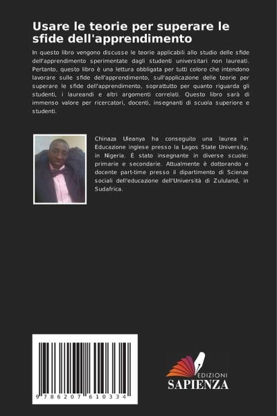 In questo libro vengono discusse le teorie applicabili allo studio delle sfide dell'apprendimento sperimentate dagli studenti universitari non laureati. Pertanto, questo libro è una lettura obbligata per tutti coloro che intendono lavorare sulle sfide dell'apprendimento, sull'applicazione delle teorie per superare le sfide dell'apprendimento, soprattutto per quanto riguarda gli studenti, i laureandi e altri argomenti correlati. Questo libro sarà di immenso valore per ricercatori, docenti, insegnanti di scuola superiore e studenti.