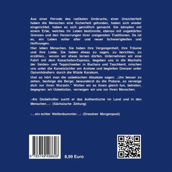 2. erweiterte AuflageAus einer Periode des radikalen Umbruchs, einer Unsicherheit haben die Menschen eine Sicherheit gefunden, haben sich wieder eingerichtet, haben es sich gemütlich gemacht. Sie kämpfen mit einem Erbe, welches ihr Leben bestimmte, ebenso mit ungeklärten Grenzen und den Verzerrungen ihrer ureigensten Traditionen. Da ist es, ein Leben voller alter und neuer Schwierigkeiten und Hoffnungen. Hier leben Menschen. Sie haben ihre Vergangenheit, ihre Träume und ihre Liebe. Sie haben etwas zu sagen, zu berichten, zu erzählen... wovon wir etwas lernen dürfen. Unternehmen wir eine Fahrt mit dem Kasachstan-Express, begeben uns in die Machalla der Seiden- und Teppichweber in Buchara und Taschkent, mischen uns unter die Kamelzüchter am Aralsee und begleiten Grenzer unter Opiumhändlern durch die Wüste Karakum.Und so hört man die usbekischen Aksakale sagen: »Um besser zu sehen, besteige die Berge; bewunderst du die Platane, so verneige dich vor ihren Wurzeln.« Wollen wir es ihnen gleich tun, betreten, begegnen wir Usbekistan, verneigen wir uns vor ihren Menschen. weitere Informationen: https://editioneurasien.de»Als Globetrotter sucht er das Authentische im Land und in den Menschen...« (Sächsische Zeitung)»...ein echter Weltenbummler...« (Dresdner Morgenpost)