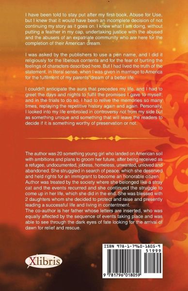 I have been told to stay put after my first book, Abuse for Use, but I knew that it would have been an incomplete decision of not continuing my story as it goes on. I knew what I am doing, without putting a feather in my cap, undertaking justice with the abused and the abusers of an expatriate community who are here for the completion of their American dream. I was asked by the publishers to use a pen name, and I did it religiously for the libelous contents and for the fear of hurting the feelings of characters described here. But I had lived the truth of the statement, in literal sense, when I was given in marriage to America for the fulfilment of my parents' dream of a better life. I couldn't anticipate the aura that precedes my life, and I had to greet the days and nights to fulfil the promises I gave to myself; and in the trials to do so, I had to relive the memories so many times, replaying the repetitive history again and again. Personally, I looked into my life embroiled in controversy not from my side but as something unique and something that will leave the readers to decide if it is something worthy of preservation or not.