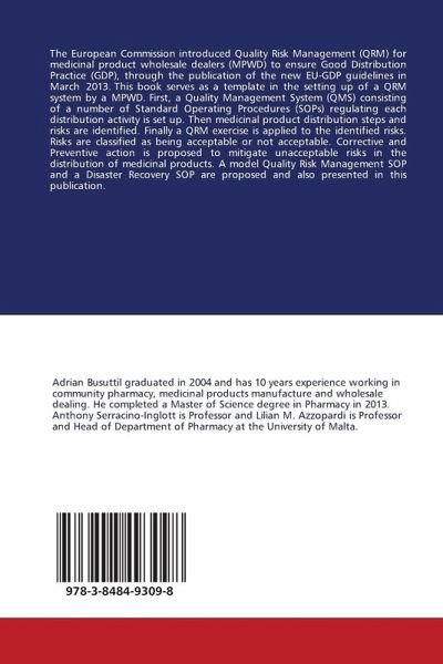 The European Commission introduced Quality Risk Management (QRM) for medicinal product wholesale dealers (MPWD) to ensure Good Distribution Practice (GDP), through the publication of the new EU-GDP guidelines in March 2013. This book serves as a template in the setting up of a QRM system by a MPWD. First, a Quality Management System (QMS) consisting of a number of Standard Operating Procedures (SOPs) regulating each distribution activity is set up. Then medicinal product distribution steps and risks are identified. Finally a QRM exercise is applied to the identified risks. Risks are classified as being acceptable or not acceptable. Corrective and Preventive action is proposed to mitigate unacceptable risks in the distribution of medicinal products. A model Quality Risk Management SOP and a Disaster Recovery SOP are proposed and also presented in this publication.