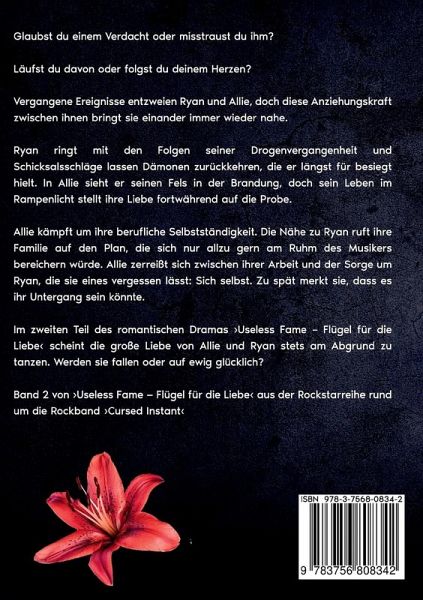 Glaubst du einem Verdacht oder misstraust du ihm?Läufst du davon oder folgst du deinem Herzen?Vergangene Ereignisse entzweien Ryan und Allie, doch diese Anziehungskraft zwischen ihnen bringt sie einander immer wieder nahe.Ryan ringt mit den Folgen seiner Drogenvergangenheit und Schicksalsschläge lassen Dämonen zurückkehren, die er längst für besiegt hielt. In Allie sieht er seinen Fels in der Brandung, doch sein Leben im Rampenlicht stellt ihre Liebe fortwährend auf die Probe.Allie kämpft um ihre berufliche Selbstständigkeit. Die Nähe zu Ryan ruft ihre Familie auf den Plan, die sich nur allzu gern am Ruhm des Musikers bereichern würde. Allie zerreißt sich zwischen ihrer Arbeit und der Sorge um Ryan, die sie eines vergessen lässt: Sich selbst. Zu spät merkt sie, dass es ihr Untergang sein könnte.Im zweiten Teil des romantischen Dramas Useless Fame - Flügel für die Liebe scheint die große Liebe von Allie und Ryan stets am Abgrund zu tanzen. Werden sie fallen oder auf ewig glücklich?Band 2 von Useless Fame - Flügel für die Liebe aus der Rockstarreihe rund um die Rockband Cursed Instant
