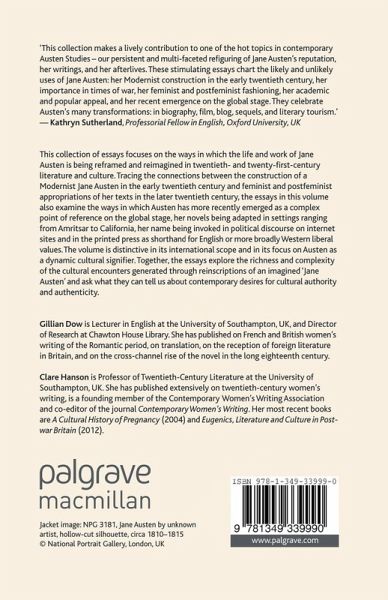 This book focuses on how Austen's life and work is being re-framed and re-imagined in 20th and 21st century literature and culture. Tracing the connections between Modernist Austen in the early C20th and feminist and post-feminist appropriations in the later C20th, it examines how Austen emerged as a complex point of reference on the global stage.