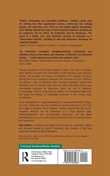 How does television function within society? Why have both its programs and its audiences been so widely denigrated? Taking inspiration from Richard Hoggarts classic study "The Uses of Literacy, " John Hartley's new book is a lucid defence of the place of television in our lives, and of the usefulness of television studies. Hartley re-conceptualizes television as a transmodern medium, capable of reuniting government, education and media, and of creating a new kind of cultural teaching which facilitates communication across social and geographical boundaries. He provides a historical framework for the development of both television and television studies, his focus ranging from an analysis of the early documentary, to the much-overlooked cultural impact of the refrigerator.