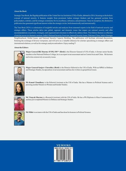 Strategic Year Book, the flagship publication of the United Service Institution (USI) of India, debuted in 2016, focusing on the holistic concept of national security. It features insights from prominent Indian strategic thinkers and has garnered acclaim from policymakers, scholars, and the strategic community for its excellence, substance, and pertinence. Since its inception, this distinctive publication has generated significant interest within the strategic circles, both domestically and internationally.The Year Book 2024 is a culmination of insightful articles and analyses from esteemed experts in the field of national security and strategic affairs. These articles delve into global, regional, and domestic issues that impact our national security and offer recommendations on policies, strategies, and organisational structures to effectively address them. This Edition features a collection of articles across six thematic sections: India's National Security Overview, Internal Security Issues, Pakistan-China, India's Strategic Neighbourhood, Global Issues, and National Security Capacity Building. The publication will facilitate informed discussions, fostering the exchange of diverse viewpoints, and will serve as a valuable reference for scholars specialising in strategic affairs and international relations, as well as for strategic analysts and authors. Enjoy reading!!!
