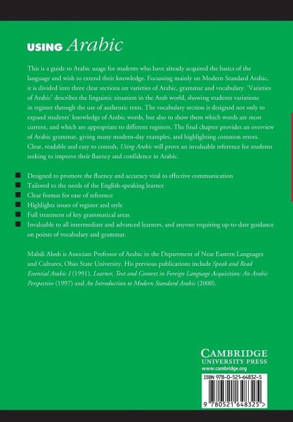 Using Arabic is a guide to Arabic usage for students who have already acquired the basics of the language and wish to extend their knowledge. Focusing mainly on Modern Standard Arabic, it is divided into three clear sections on varieties of Arabic, grammar, and vocabulary. 'Varieties of Arabic' describes the linguistic situation in the Arab world, showing students variations in register through the use of authentic texts. The vocabulary section is designed not only to expand students' knowledge of Arabic words, but also to show them which words are most current, and which are appropriate to different registers. The final chapter provides an overview of Arabic grammar, giving many modern-day examples, and highlighting common errors. Clear, readable and easy to consult, Using Arabic will prove an invaluable reference for students seeking to improve their fluency and confidence in Arabic.
