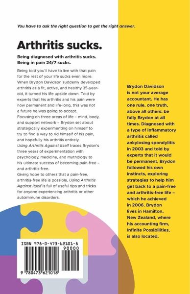 You have to ask the right question to get the right answer. Arthritis sucks. Being diagnosed with arthritis sucks. Being in pain 24/7 sucks. Being told you'll have to live with that pain for the rest of your life sucks even more. When Brydon Davidson suddenly developed arthritis as a fit, active, and healthy 35-year-old, it turned his life upside down. Told by experts that his arthritis and his pain were now permanent and life-long, this was not a future he was going to accept. Focusing on three areas of life - mind, body, and support network - Brydon set about strategically experimenting on himself to try to find a way to rid himself of his pain, and hopefully his arthritis entirely. Using Arthritis Against Itself traces Brydon's three years of experimentation with psychology, medicine, and mythology to his ultimate success of becoming pain-free - and arthritis-free. Giving hope to others that a pain-free, arthritis-free life is possible, Using Arthritis Against Itself is full of useful tips and tricks for anyone experiencing arthritis or other autoimmune disorders