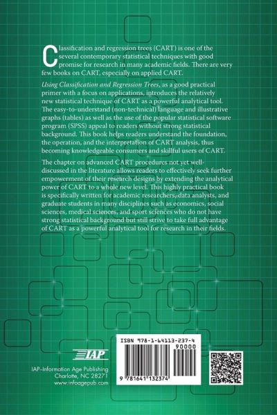 Classification and regression trees (CART) is one of the several contemporary statistical techniques with good promise for research in many academic fields. There are very few books on CART, especially on applied CART. This book, as a good practical primer with a focus on applications, introduces the relatively new statistical technique of CART as a powerful analytical tool. The easy-to-understand (non-technical) language and illustrative graphs (tables) as well as the use of the popular statistical software program (SPSS) appeal to readers without strong statistical background. This book helps readers understand the foundation, the operation, and the interpretation of CART analysis, thus becoming knowledgeable consumers and skillful users of CART. The chapter on advanced CART procedures not yet well-discussed in the literature allows readers to effectively seek further empowerment of their research designs by extending the analytical power of CART to a whole new level. This highly practical book is specifically written for academic researchers, data analysts, and graduate students in many disciplines such as economics, social sciences, medical sciences, and sport sciences who do not have strong statistical background but still strive to take full advantage of CART as a powerful analytical tool for research in their fields.