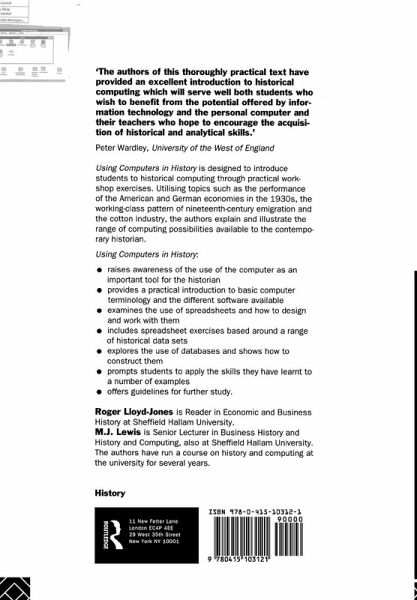Using Computers in History is designed to introduce students to historical computing through practical workshop exercises. With topics such as the pattern of nineteenth century emigration from the UK, the performance of the American and German economies in the 1930s and the Lancashire cotton industry, Lloyd-Jones and Lewis explain and illustrate the possible uses of the computer for the historian. Using Computers in History: * raises awareness of the use of computers as an important tool for the historian * provides a practical introduction to basic computer terminology * includes high quality diagrams of the screen displays which should appear at each stage * examines the use of spreadsheets and how to design and work with them * discusses the different software packages available, concentrating on Microsoft Excel 4 * includes spreadsheet exercises based around a range of historical data sets * explores the use of databases * shows how to construct them * gives guidelines for further study * prompts students to apply the skills they have learnt to a number of examples