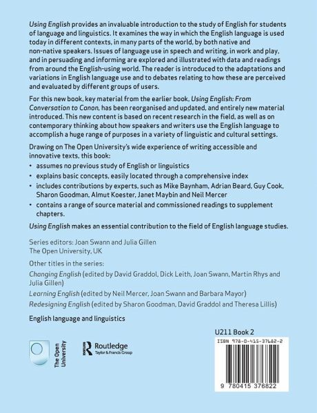 Using English provides an invaluable introduction to the study of English for students of language and linguistics. It examines the way in which the English language is used today in different contexts and in many parts of the world, by both native and non-native speakers. Issues of language use in speech and writing, in work and play, and in persuading and informing are explored and illustrated with data and readings from around the English-using world. The reader is introduced to the adaptations and variations in English language use and to debates relating to how these are perceived and evaluated by different groups of users. For this second edition, key material from the earlier bestselling book, Using English: From Conversation to Canon, has been reorganized and updated, and entirely new material has been introduced. This new content is based on recent research in the field, as well as on contemporary thinking about how speakers and writers use the English language to accomplish a huge range of purposes in a variety of linguistic and cultural settings. Drawing on The Open University's wide experience of writing accessible and innovative texts, this book: explains basic concepts, easily located through a comprehensive index, includes contributions by experts in the field, such as Mike Baynham, Adrian Beard, Guy Cook, Sharon Goodman, Almut Koester, Janet Maybin and Neil Mercer, contains a range of source material and commissioned readings to supplement chapters.