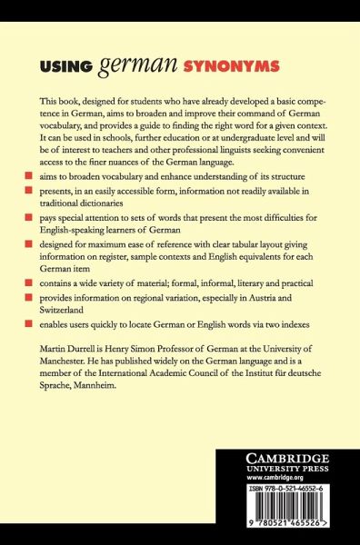 This book, designed for students who have already developed a basic competence in German, aims to broaden and improve their vocabulary by providing detailed information on groups of German words with related meanings. It is invaluable as a guide to finding the right word for the context. In order to enhance understanding of the structure of the German vocabulary, groups of synonyms are organised under German (rather than English) headwords. All entries are accompanied by an example of usage and English glosses and there are two indexes allowing users quickly to locate words in German or English. The book takes full account of register variation, indicating the degree of formal or informal use, and reflects regional usage especially in Austria and Switzerland. It is an essential reference for intermediate and advanced students as well as teachers and other professional linguists seeking access to the finer nuances of the German language.