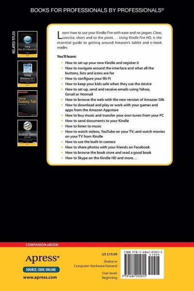 Learn how to use your Kindle Fire with ease and no jargon. Clear, concise, short and to the point... Using Kindle Fire HD, is the essential guide to getting around Amazon s tablet/e-book reader. This book explores setting up your new Kindle and registering; navigating around the interface and what all the buttons, lists and icons are for; configuring your WiFi; keeping your kids safe when they use the device with parental controls; setting up, sending and receiving emails using Yahoo, Gmail or Hotmail; and browsing the web with the new version of Amazon Silk.