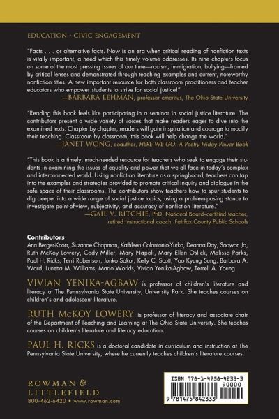 The book examines social issues prevalent in nonfiction literature and texts for children, their impact on society, and offers ideas on how educators might guide students to engage these issues effectively and critically.
