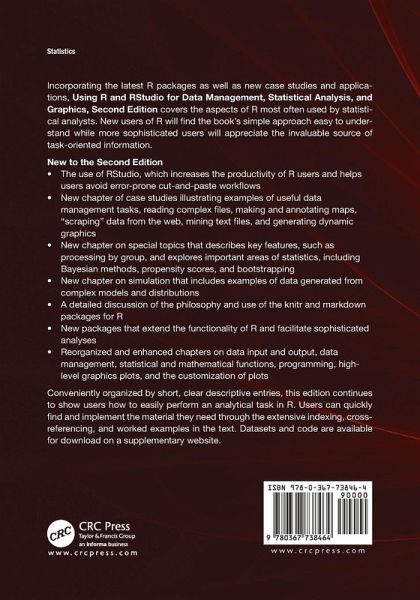 Improve Your Analytical Skills Incorporating the latest R packages as well as new case studies and applications, Using R and RStudio for Data Management, Statistical Analysis, and Graphics, Second Edition covers the aspects of R most often used by statistical analysts. New users of R will find the book's simple approach easy to understand while more sophisticated users will appreciate the invaluable source of task-oriented information. New to the Second Edition The use of RStudio, which increases the productivity of R users and helps users avoid error-prone cut-and-paste workflows New chapter of case studies illustrating examples of useful data management tasks, reading complex files, making and annotating maps, "scraping" data from the web, mining text files, and generating dynamic graphics New chapter on special topics that describes key features, such as processing by group, and explores important areas of statistics, including Bayesian methods, propensity scores, and bootstrapping New chapter on simulation that includes examples of data generated from complex models and distributions A detailed discussion of the philosophy and use of the knitr and markdown packages for R New packages that extend the functionality of R and facilitate sophisticated analyses Reorganized and enhanced chapters on data input and output, data management, statistical and mathematical functions, programming, high-level graphics plots, and the customization of plots Easily Find Your Desired Task Conveniently organized by short, clear descriptive entries, this edition continues to show users how to easily perform an analytical task in R. Users can quickly find and implement the material they need through the extensive indexing, cross-referencing, and worked examples in the text. Datasets and code are available for download on a supplementary website.
