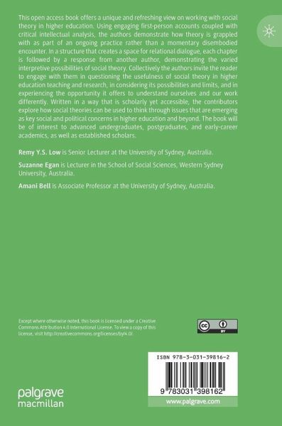 This open access book offers a unique and refreshing view on working with social theory in higher education. Using engaging first-person accounts coupled with critical intellectual analysis, the authors demonstrate how theory is grappled with as part of an ongoing practice rather than a momentary disembodied encounter. In a structure that creates a space for relational dialogue, each chapter is followed by a response from another author, demonstrating the varied interpretive possibilities of social theory. Collectively the authors invite the reader to engage with them in questioning the usefulness of social theory in higher education teaching and research, in considering its possibilities and limits, and in experiencing the opportunity it offers to understand ourselves and our work differently. Written in a way that is scholarly yet accessible, the contributors explore how social theories can be used to think through issues that are emerging as key social and political concerns in higher education and beyond. The book will be of interest to advanced undergraduates, postgraduates, and early-career academics, as well as established scholars.
