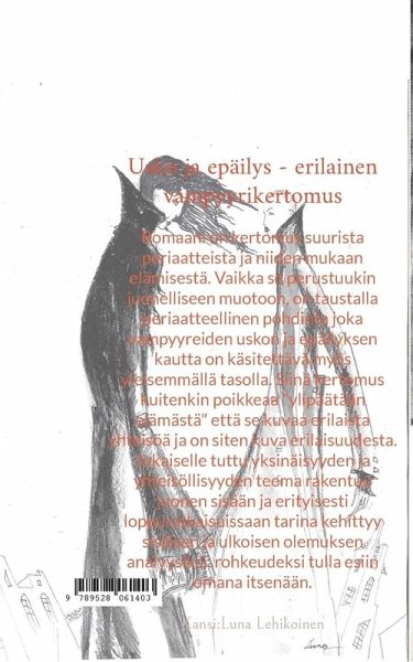 Usko ja epäilys - erilainen vampyyrikertomus Romaani on kertomus suurista periaatteista ja niiden mukaan elämisestä. Vaikka se perustuukin juonelliseen muotoon, on taustalla periaatteellinen pohdinta joka vampyyreiden uskon ja epäilyksen kautta on käsitettävä myös yleisemmällä tasolla. Siinä kertomus kuitenkin poikkeaa "ylipäätään elämästä" että se kuvaa erilaista yhteisöä ja on siten kuva erilaisuudesta. Jokaiselle tuttu yksinäisyyden ja yhteisöllisyyden teema rakentuu juonen sisään ja erityisesti loppuratkaisuissaan tarina kehittyy sisäisen ja ulkoisen olemuksen analyysiksi; rohkeudeksi tulla esiin omana itsenään.